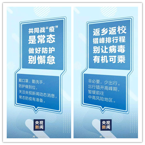 寒假期间少扎堆、不聚集,减少不必要的聚餐聚会,不邀约中高风险地区来常人员聚会聚餐;尽量不参加大型会议、演出等人群聚集性活动;建议春节期间不串门拜年,使用微信、视频、电话等非接触拜年。