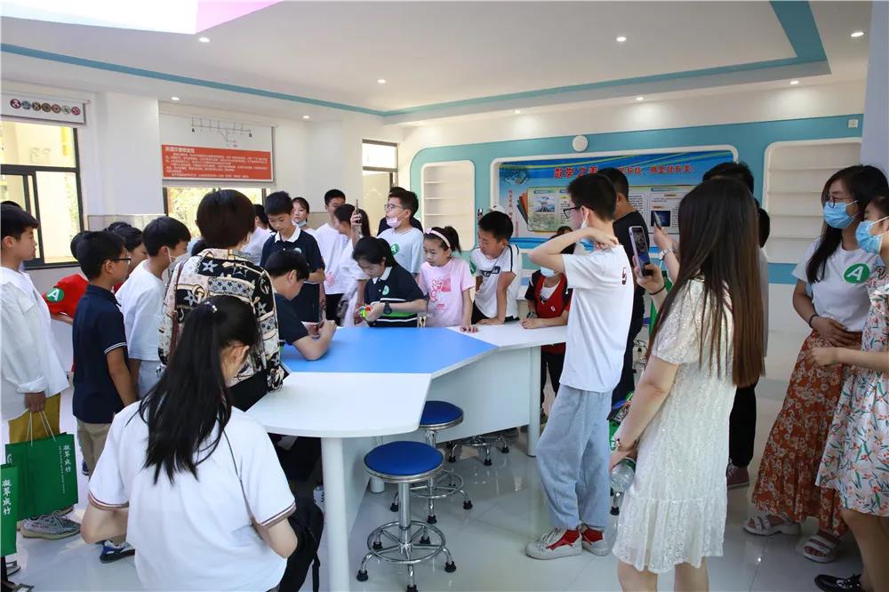 在青年教师志愿者及学生志愿者的引导下,看校团的家长和学生分组有序地深入学校参观孩子们即将生活、学习的校园。图书馆、书香长廊、读书角……处处彰显学习氛围。