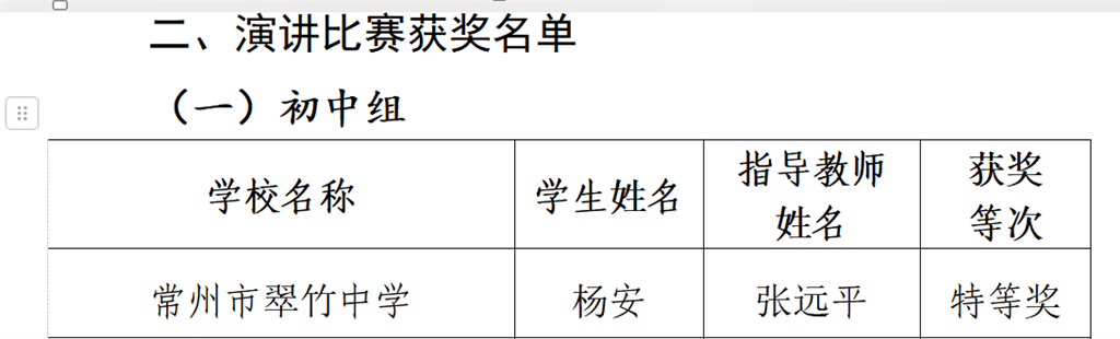 一路耕耘,一路收获!绚烂热烈的夏暮,翠竹中学喜报频传! 在2024年常州市教育局举办的“学宪法 讲宪法”活动中,我校获得局属“优秀组织奖”,九(5)班杨安同学凭借出色的表现,获得直属学校演讲比赛初中组特等奖,九(9)班陈灿萱同学获得常州市中小学校素养竞赛初中组一等奖。 我校一直以来重视法治教育,通过一系列丰富多彩、形式多样的教育活动,有效提升全校师生的宪法意识和法治素养,营造了良好的校园法治氛围。未来,学校将继续加强法治宣传教育,创新教育方式方法,提高教育实效。同时,我们还将加强与社区、家庭等各方面的合作,共同构建全方位的法治教育体系,为学生的全面发展和社会的和谐稳定贡献力量。 “双减”政策实施以来,我校秉承“以德树人、以美育人、以文化人、面向人人”的教育理念,积极开发特色课程进校园系列行动。 近日,在常州市第五批中小学“双减”工作优秀实践案例暨重点实验项目评选中,我校张慧琳老师撰写的《竹音吟韵:“双减”背景下本土文化的课程开发与传承发展》案例荣获一等奖重点项目。 案例简介 学校通过挖掘本校资源、引进校外资源等方式挖掘擅长常州本土文化的优秀指导教师,利用校本课程开展、研究性学习组织、兴趣社团组建、课余实践拓展等途径在培养学生兴趣与能力的同时,传承发展优秀传统文化。 学校特邀常州吟诵国家非遗主要传承人顾勤元老师开设“浅诵低吟”常州吟诵校本课,丰富学生课余生活。综合实践课上学生也以此为课题积极开展研究活动。 此外,我校将校园“竹文化”与“常州吟诵”文化相结合,开创校园特色活动,编创吟诵曲目,以文化人,以美育人,不断提升学生的审美水平,增强文化自信,推动校园文化建设,为常州非遗文化的传承与发展贡献力量。 千川汇海阔,风好正扬帆。翠竹中学师生将不断挑战自我,绘就教育新画卷! 撰稿:柏佩婷 审核:宋华燕