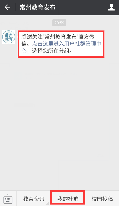 二、 粉丝管理平台填写说明 在关注“常州教育发布”后,会收到关注后的提示消息,点击即可进入用户社群管理平台,选择所在的组别后完成用户分组操作。已关注的用户,可以直接点击菜单“我的社群”或者回复关键词“社群管理”进入分组页面。 在我的社群里选择“常州市翠竹中学”
