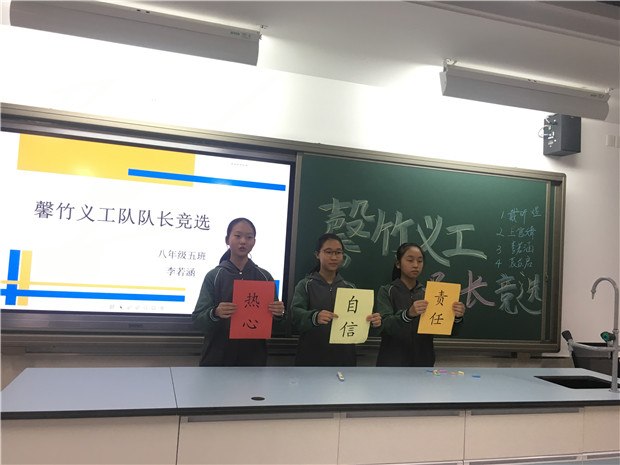 2017年9月29日,翠竹中学馨竹义工大队长竞选活动开始啦!看~ 燃!8位选手各显神通—— 有的解读自己对义工的认识,有的分享自己参加义工活动的经历,有的畅谈自己对义工队长工作的设计……制作精美的PPT,流畅响亮的演讲,聪慧机智的答辩,自信大胆的神态,都给在座的评委老师和观众们留下了深刻而美好的印象。 暖!拉拉队尽显精彩—— 跳动的色彩绘成五彩斑斓的海报,动人的嗓音唱出舞动人心的加油歌,俏皮的话语演绎令人捧腹的三句半……原来是拉拉队在为自己的选手呐喊助威,小伙伴们卖力地宣传着自己的选手们,形式多样,创意十足,有的还请来了班主任助阵打气,精彩尽显!他们的表现丝毫不逊色8个小选手! 盼!馨竹义工新发展—— 8名优秀的选手个性各异,各有千秋,他们的加入,他们对义工的热心,让我们坚信:我校馨竹义工一定能更好的发展!