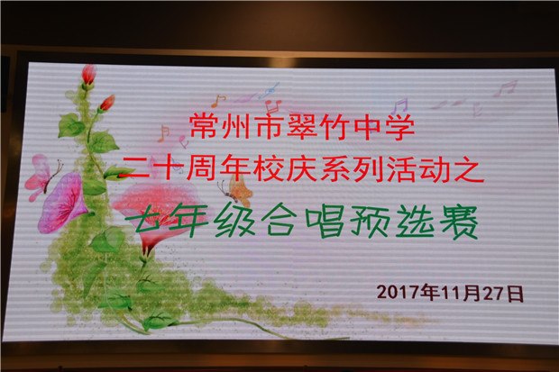 为更好地推进素质教育,丰富校园文化,营造积极向上、清新高雅、健康文明的校园文化气氛,增强学生的团队意识和集体荣誉感,常州市翠竹中学于2017年11月27日在体育馆举行了七年级“唱响校园.放飞梦想”的合唱比赛。 本次比赛共有七年级八个班级参与其中,以班级为单位,全员参与,各班分别合唱两首曲目。各班积极准备、精心排练,同学们用甜美的歌声、灿烂的笑脸,向亲爱的学校、美好的生活表达深深的热爱。嘹亮的歌声在体育馆回响,飞扬的旋律在同学们心中回荡。 青春因梦想而精彩,生命因活力而绽放,校园有了多彩的文化,就有了深厚的底蕴。此次合唱比赛,作为翠竹中学20周年校庆活动的一部分,又一次为学生成长搭建了崭新的平台,让学生尽情唱响青春的梦想,绽放生命的活力,开启梦想的航程。