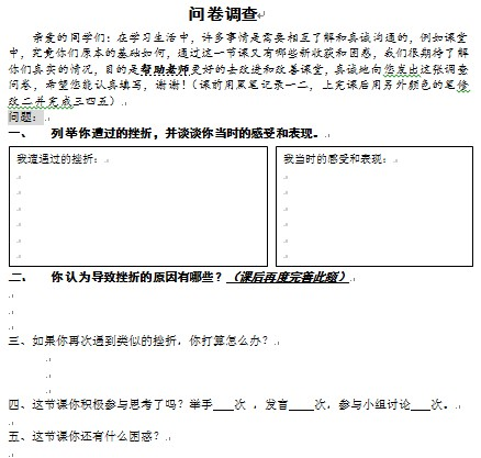 课后再度完成调查表则是对学生学习状况的一种检查,是学生学习效果的一种反馈。调查表明绝大多数学生在课堂都能积极参与,思维能力有所提高,对挫折的影响成因把握得比较好。调查也反映了一个问题,那就是在这节课你还有什么困惑这个问题上,所有同学的回答都是无。这充分反映出学生的问题意识淡薄,主动积极思考的意识不强。造成这种现象的因素是多方面的,反观自己的教学,可能平时教学中往往越俎代庖,不仅替学生提出问题,而且替学生分析做答。没有给学生留下充分的思考时间,也缺少引发学生发散思维的必要启迪,而是急于把自己所谓正确的标准答案和方法塞给学生。